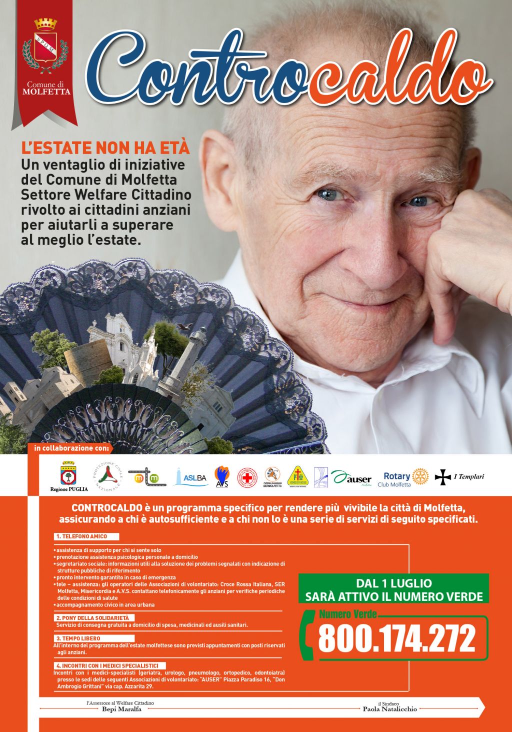 Parte mercoledì 1 luglio il progetto "ControCaldo" promosso dall'assessorato alle politiche sociali del Comune di Molfetta, volto ad assicurare agli anziani, autosufficienti e non, la predisposizione di ausili per vivere meglio la stagione estiva, assicurando loro una serie di servizi di cura della salute, di assistenza telefonica e personale, nonché di svago nel tempo libero."La città - spiega l'assessore al welfare Bepi Maralfa - annovera nella sua popolazione circa 12 mila anziani, sicché nella previsione delle criticità che il periodo estivo, a motivo del naturale aumento delle temperature, porta con sé, si è ritenuto di pianificare una serie di iniziative volte a tutelare la salute degli anziani, nei casi più gravi e complessi come pure in quelli quotidiani, fornendo loro ausili socio assistenziali e piccoli servizi a misura d'uomo che possano aiutarli a sentirsi tutelati nella salute, protetti e meno soli.