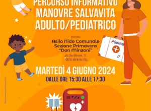 Il Settore Socialità e l’Amministrazione comunale rendono noto che, nell’ambito del PIANO DI INTERVENTO INFANZIA AZIONE DI RAFFORZAMENTO TERRITORIALE PAC INFANZIA, in collaborazione con Koinos S.C.S. ONLUS e A.V. CH 9 S.E.R. MOLFETTA ONLUS, presso il Nido Comunale “Don Minzoni” si terrà un Percorso informativo manovre salvavita adulto/pediatrico martedì 4 giugno p.v. dalle ore 15.30 alle ore 17.30 a cura del S.E.R. MOLFETTA. Il percorso informativo è rivolto alle famiglie dei bambini frequentanti il Nido comunale a.e. 2023/2024 ed al personale educativo in servizio presso il Nido. Al termine del corso ci sarà la consegna di un defibrillatore.