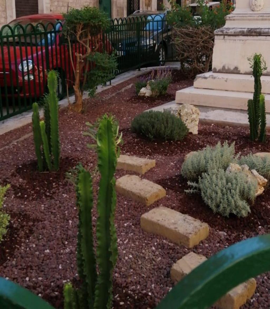 Gli interventi effettuati, con costi decisamente contenuti, hanno visto all’opera gli uomini della Multiservizi. La pietra pomice presente è stata “recuperata” nel corso di lavori in altri giardini cittadini: Le altre pietre presenti sono quelle selezionate a seguito della rimozione del muretto a secco di Lama di macina. La progettazione dell’area a verde è stata curata, su disposizione del presidente, Giulio la Grasta, dal direttore tecnico della Multiservizi, Gianni Caputo.
