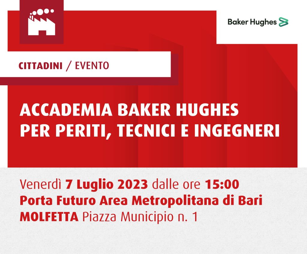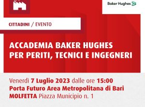 Venerdì 7 luglio alle ore 15:00, in Piazza Municipio 1 a Molfetta, presso il job centre di Porta Futuro Area Metropolitana di Bari, si terrà la presentazione dell’Accademia Baker Hughes per periti, tecnici, ingegneri.