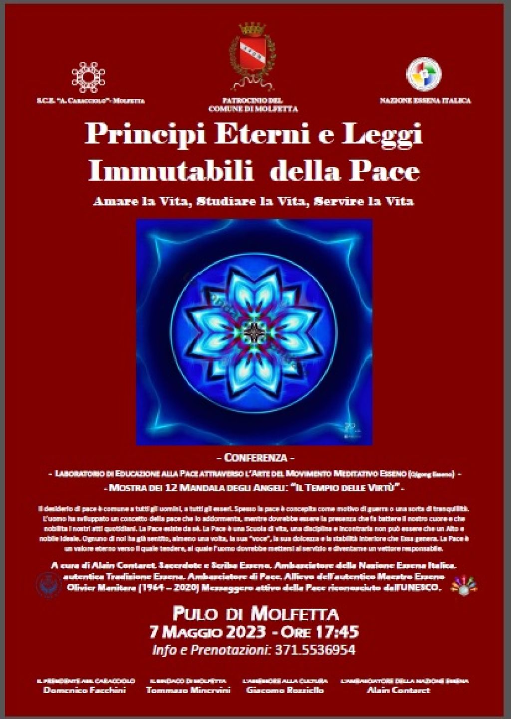 Dopo il successo della Mostra “Mandala degli Angeli”, tenutasi nella Sala dei Templari di Molfetta, dall'8 al 18 Ottobre 2022, che ha visto la presenza di più di 800 visitatori, la Nazione Essena Italica torna a Molfetta con un evento unico nel suo genere, a cura di Alain Contaret, Sacerdote e Scriba Esseno, Ambasciatore della Nazione Essena Italica, autentica Tradizione Essena, Ambasciatore di Pace e dei Sacerdoti e Sacerdotesse Essene.