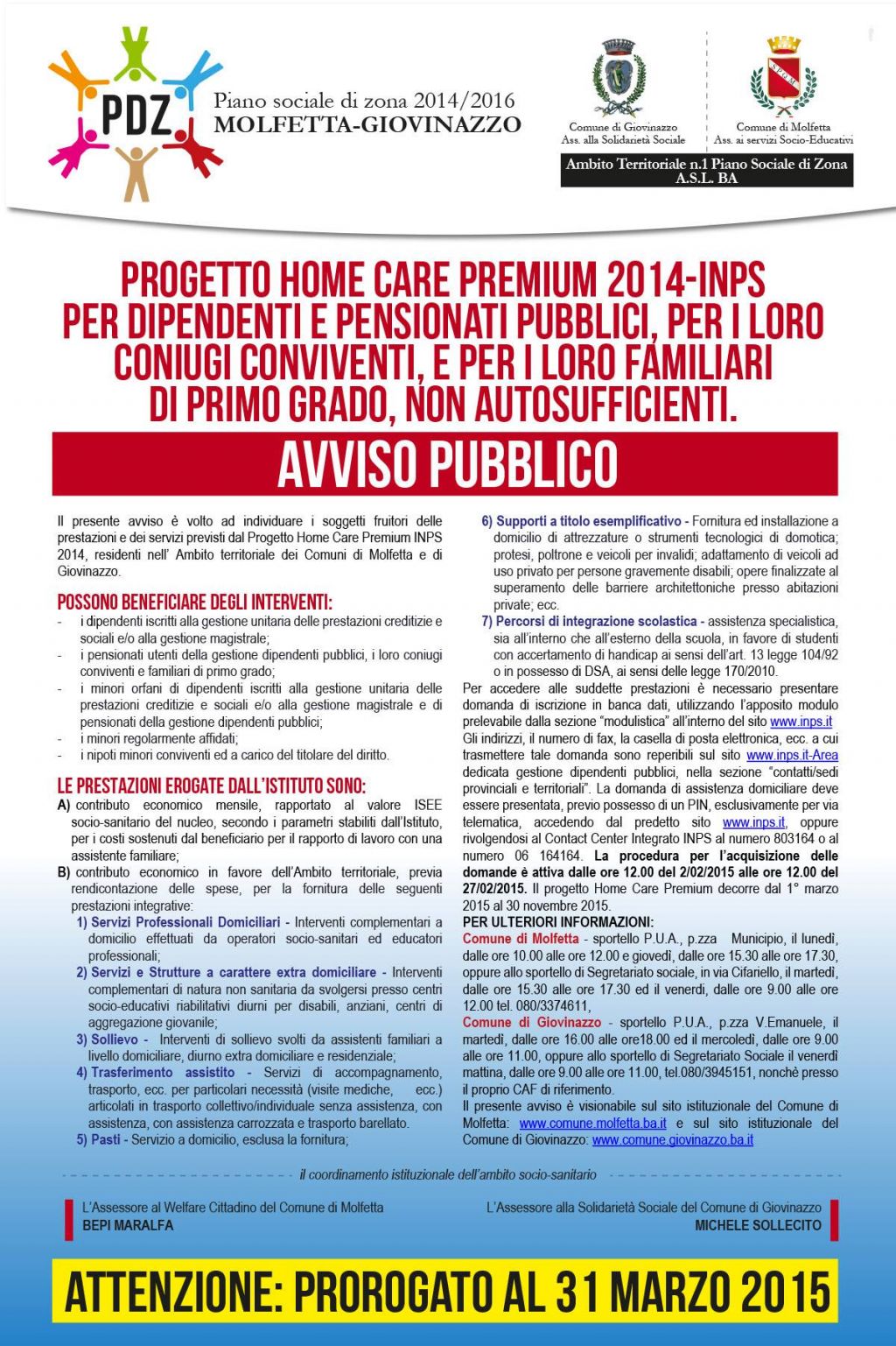 Il presente avviso è volto ad individuare i soggetti fruitori delle prestazioni e dei servizi previsti dal Progetto Home Care Premium INPS 2014, residenti nell' Ambito territoriale dei Comuni di Molfetta e di Giovinazzo.