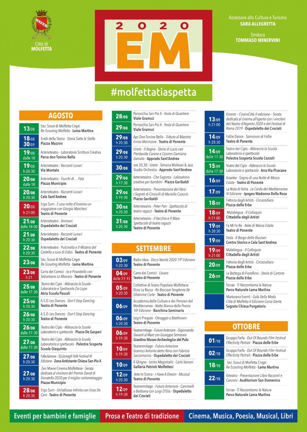 «Il cartellone EVENTI MOLFETTA 2020 – sottolinea l’Assessore alla Cultura, Sara Allegretta - sarà un’edizione speciale. Tanti gli appuntamenti in programma, mantenendo sempre lo standard di qualità che ci ha contraddistinto in questi tre anni. Nello spirito della destagionalizzazione, che da sempre ha caratterizzato l’attività culturale dell’Assessorato, anche quest’anno il cartellone arriverà fino al mese di ottobre con importanti iniziative. Teatro di prosa e di tradizione, eventi cinematografici, teatro e laboratori per bambini, mostre e libri, musica e poesia, danza e musical, passeggiate culturali a Lama Martina, tutto orientato alla valorizzazione dei luoghi storici, delle piazze, dei quartieri, del mare e delle nostre eccellenze artistiche. Un programma che – conclude - si svolgerà in sicurezza e nel sostegno all’intero settore Cultura, uno dei comparti che maggiormente ha sofferto in questi mesi di lockdown».
