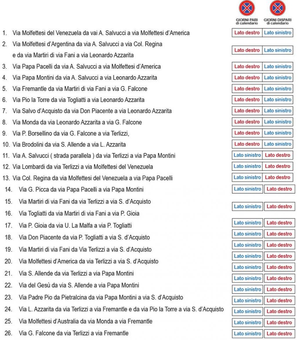Il divieto di fermata a lati alterni nei giorni dispari (1, 3, 5 del mese in corso) e giorni pari è valido nella fascia oraria dalle 8 alle 10 (escluso i giorni festivi e il giovedì) come già indicato dalla segnaletica verticale presente (e in grafica) e sono chiamati a osservarlo non solo i residenti ma tutti coloro che per lavoro o per fare la spesa lasciano in sosta la propria auto negli orari coperti dalla pulizia.