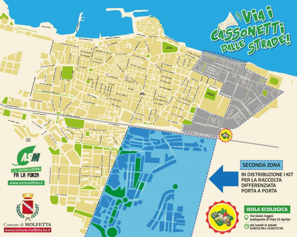 Mappa_portaaporta_zona2Domenica 14 febbraio i cittadini residenti nelle zone ricomprese tra l'area retrostante la stazione ferroviaria, via Terlizzi, via Bitonto e la complanare di accesso alla SS16 uscita Molfetta centro, quindi tutto il quartiere Poggiofiorito, Madonna della Rosa, via Ungaretti, i comparti di espansione 1-9 , dovranno esporre all'esterno delle loro abitazioni e all'ingresso dei condomini i mastelli marroni contenenti gli scarti alimentari.