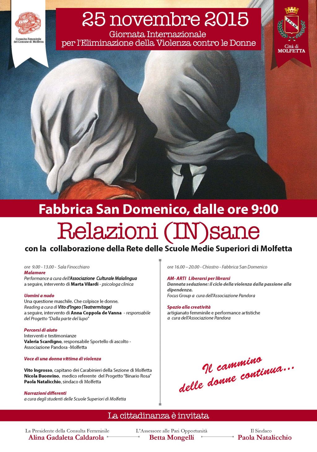 Nonostante i tanti percorsi legislativi ed educativi messi in atto per contrastare la violenza nei confronti delle donne, le cronache quotidianamente continuano a riproporre storie dolorose che coinvolgono persone di ogni età, cultura, stato sociale. In occasione del 25 novembre 2015 "Giornata internazionale per l'eliminazione della violenza contro le donne" la Consulta Femminile del Comune di Molfetta organizza il convegno "RELAZIONI (IN) SANE" in collaborazione con la Rete delle scuole superiori di Molfetta. La manifestazione è parte di un percorso comune con le scuole per coinvolgere soprattutto i giovani nella costruzione di relazioni sane, fondate sul reciproco rispetto tra uomini e donne e per un momento collettivo di riflessione anche sul ruolo maschile determinante nella problematica sociale della violenza che colpisce le donne.L'incontro con la rappresentanza di studenti di tutte le scuole superiori di Molfetta si terrà mercoledì 25 novembre, nella Sala Finocchiaro, Fabbrica S. Domenico dalle 9.00 alle 13.00. Il convegno è ricco di momenti diversi, tra cui interventi teatrali a cura di Malalingua e del Teatremitage e testimonianze per riflettere sulle diverse forme di violenza. Si discuterà di azioni di contrasto e di aiuto e delle risposte della città con gli interventi di Marta Vilardi, psicologa, Anna Coppola De Vanna, responsabile del progetto "Dalla parte del lupo", Valeria Scardigno dell'Associazione Pandora, Cap. Vito Ingrosso, comandante della Compagnia Carabinieri di Molfetta, Nicola Buonvino, medico referente del Progetto "Binario Rosa" e il sindaco Paola Natalicchio. La giornata sarà arricchita dalle performance e dai contributi creativi degli studenti. Poi nel pomeriggio ci sarà, nel Chiostro della Fabbrica di S. Domenico, dalle 16.00 alle 20.00, un altro momento collettivo di analisi sul tema dell' Am-arti. Liberarsi per librarsi a cura dell''Associazione Pandora che proporrà dei Focus Group su Dannata seduzione: il ciclo della violenza dalla passione alla dipendenza e uno Spazio dedicato alla creatività con artigianato femminile e performance artistiche.