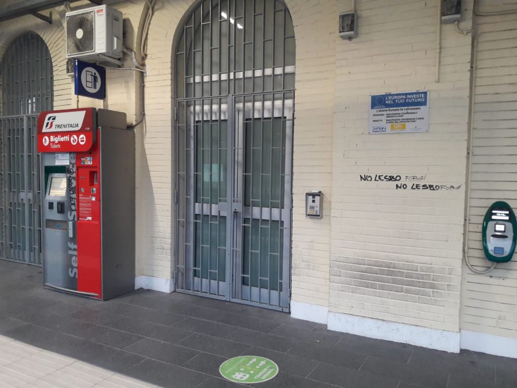 I muri della stazione sono tornati puliti. Sono state rimosse le scritte lesbofobiche lasciate da qualcuno su uno dei muri perimetrali della stazione ferroviaria. A chiederne la rimozione a Rete ferrovie Italiane è stata la Polizia locale.