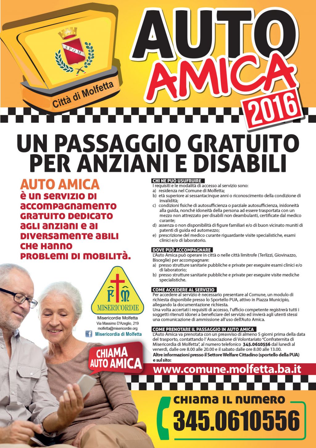 L'Auto Amica va prenotata con un preavviso di almeno 5 giorni prima della data del trasporto, contattando l' Associazione di Volontariato "Confraternita di Misericordia di Molfetta", al numero telefonico 345.0610556 dal lunedì al venerdì, dalle ore 8.00 alle 20.00 e il sabato dalle ore 8.00 alle 13.00.