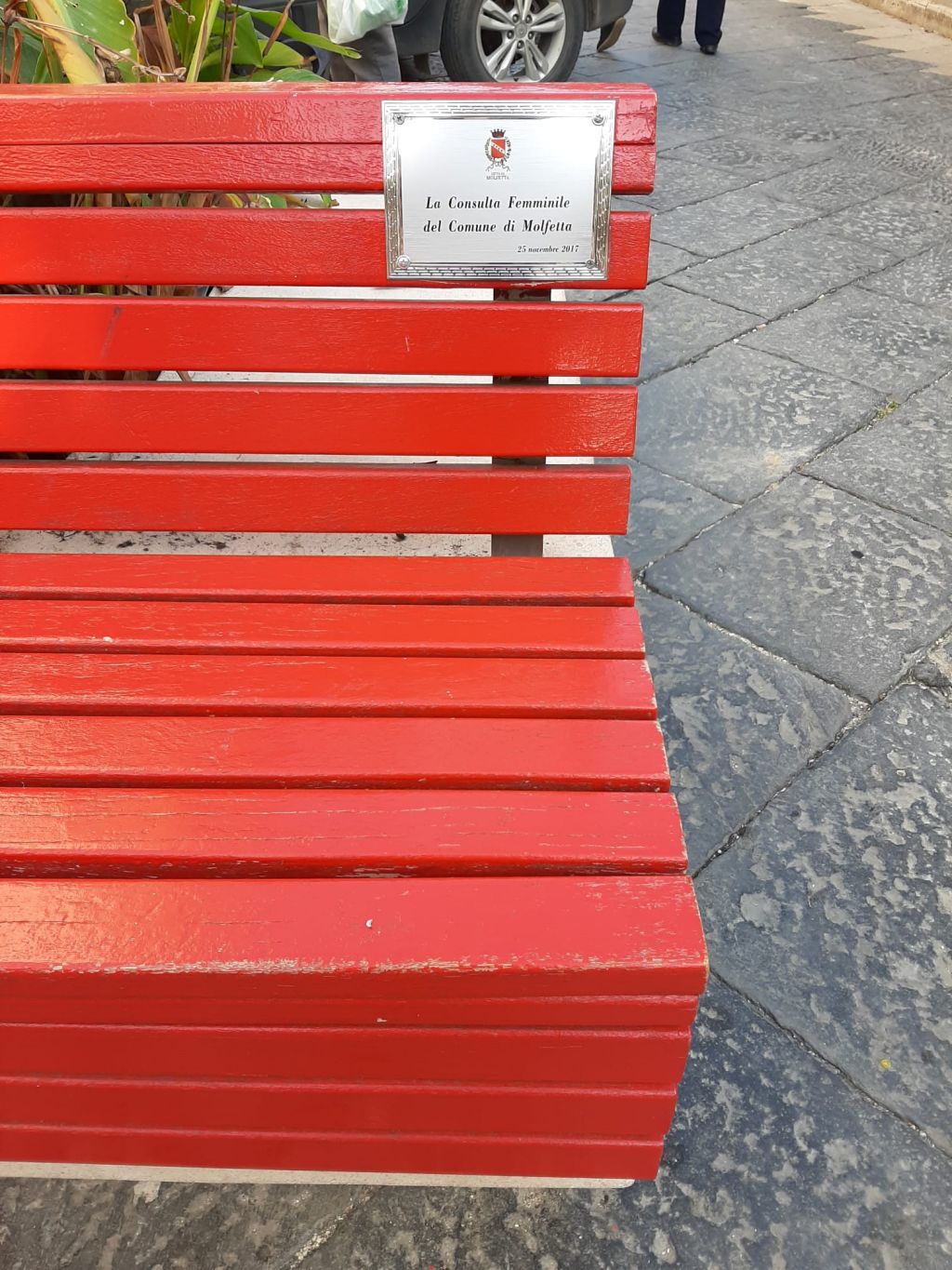 Con la collaborazione dell'Amministrazione comunale, nel 2017, furono realizzate a Molfetta, tre “panchine rosse”, collocate in zone diverse della città, dedicate a tutte le donne vittime di violenza di genere, a tutte quelle che in ogni tempo, in ogni luogo ed in ogni condizione subiscono violenza.