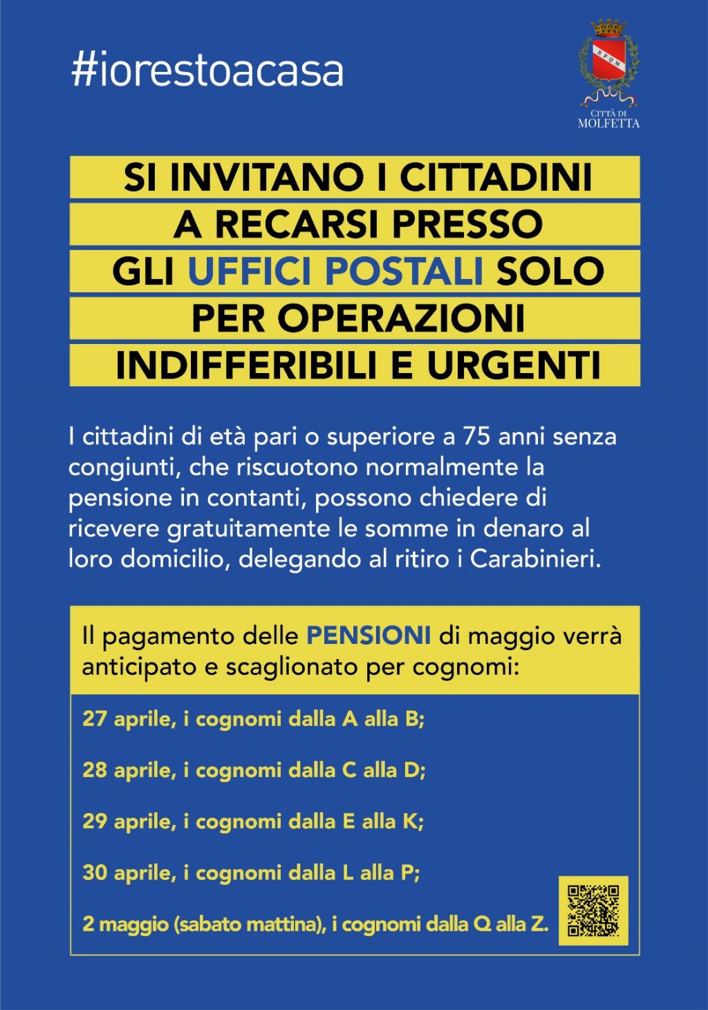 A partire da lunedì 27 aprile inizierà il ritiro delle pensioni di maggio per i cognomi che iniziano per A e B. Si invitano tutti i pensionati a recarsi presso gli uffici postali anche negli orari pomeridiani in maniera da evitare lunghe code e disservizi.