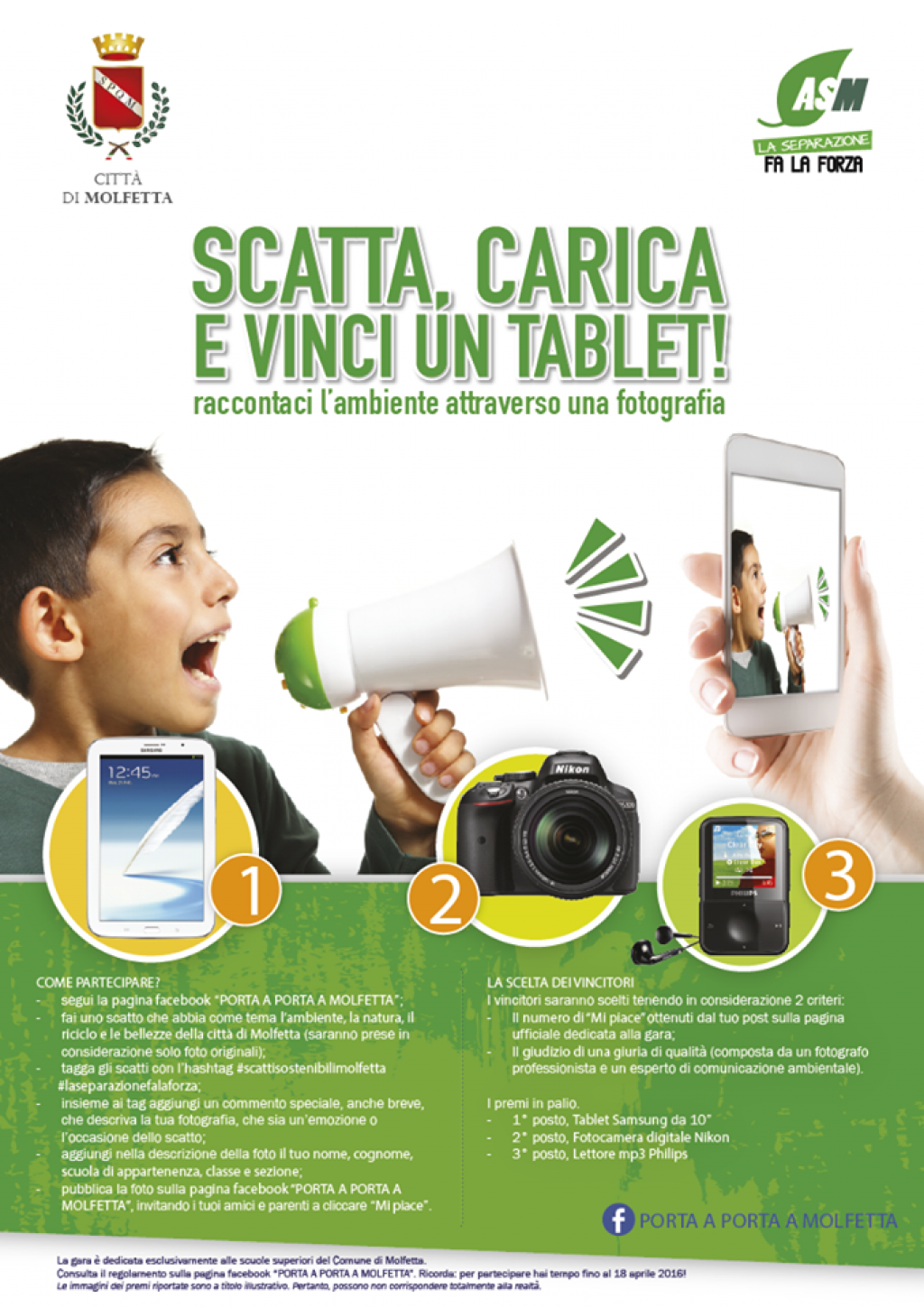 Raccontare la raccolta differenziata e la bellezza della propria città con uno scatto. Il Comune di Molfetta e la ASM, chiamano gli studenti delle scuole secondarie di secondo grado a partecipare al contest fotografico a premi ?#?SCATTISOSTENIBILIMOLFETTA.Si tratta di una azione di sensibilizzazione e promozione rivolta agli studenti che accompagna la diffusione del nuovo servizio di raccolta dei rifiuti porta a porta. Mentre nelle scuole primarie l'attività di educazione ambientale è affidata a Capitan Eco, nelle scuole medie si sta svolgendo il progetto "Mettiamoli alla porta" delle associazioni Riciclando, Legambiente, Passi da Ciclope, Terrae ed Ecoalfa, per coinvolgere gli studenti delle scuole superiori si è pensato di farli interagire con il nuovo servizio attraverso l'uso dei social network e la grande familiarità che hanno con gli scatti fotografici degli smartphone.