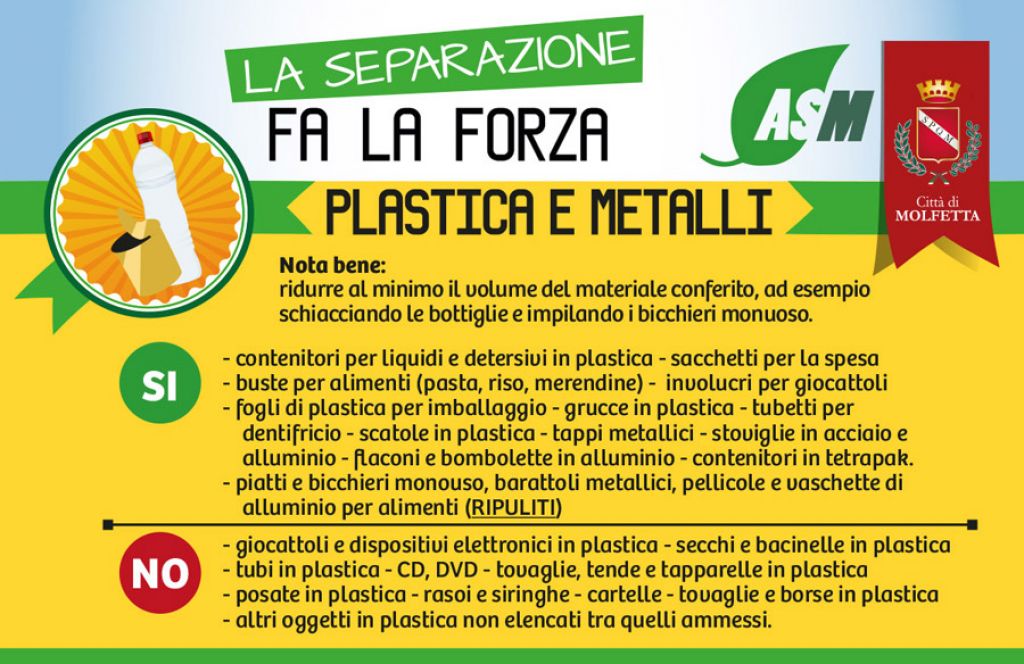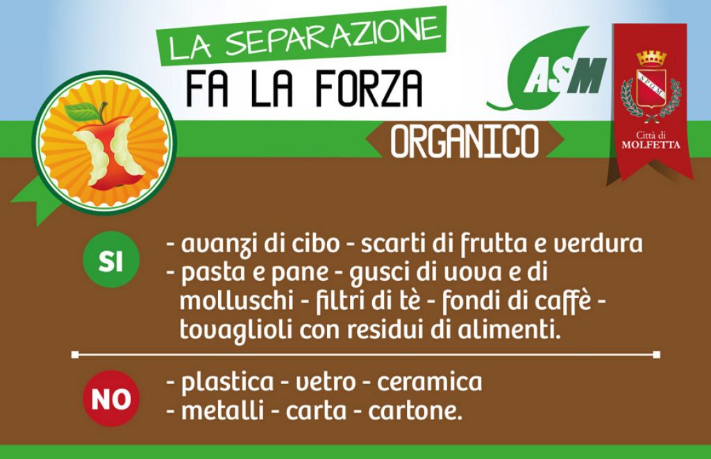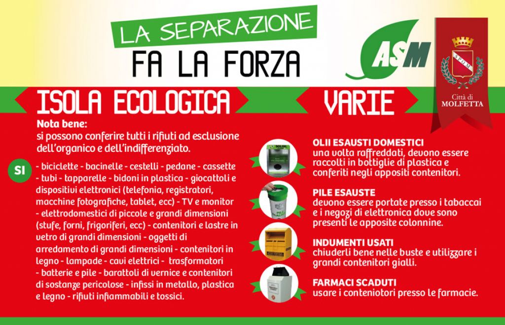 La percentuale di raccolta differenziata a Molfetta è fermo al 30%. Per evitare di pagare l'ecotassa occorre aumentare del 5% questa percentuale entro giugno. Da gennaio è partita la campagna di Asm e Comune di Molfetta: "La separazione fa la forza". A tutte le famiglie è stato distribuito materiale informativo che spiega l'entrata in vigore dell'ecotassa e come differenziare meglio tutti i rifiuti. In città sono stati messi oltre 500 nuovi contenitori. La raccolta dell'umido è stata estesa anche nelle zone periferiche di levante dalle quali era assente e nelle zone di espansione sono stati messi i bidoni per la plastica, il vetro, la carta, l'olio. Nelle scuole sono partite le "Cartoniadi", per educare e incentivare i bambini alla raccolta di carta e cartone in famiglia. In questi giorni sarà sulle plance una nuova campagna di comunicazione per responsabilizzare i cittadini.