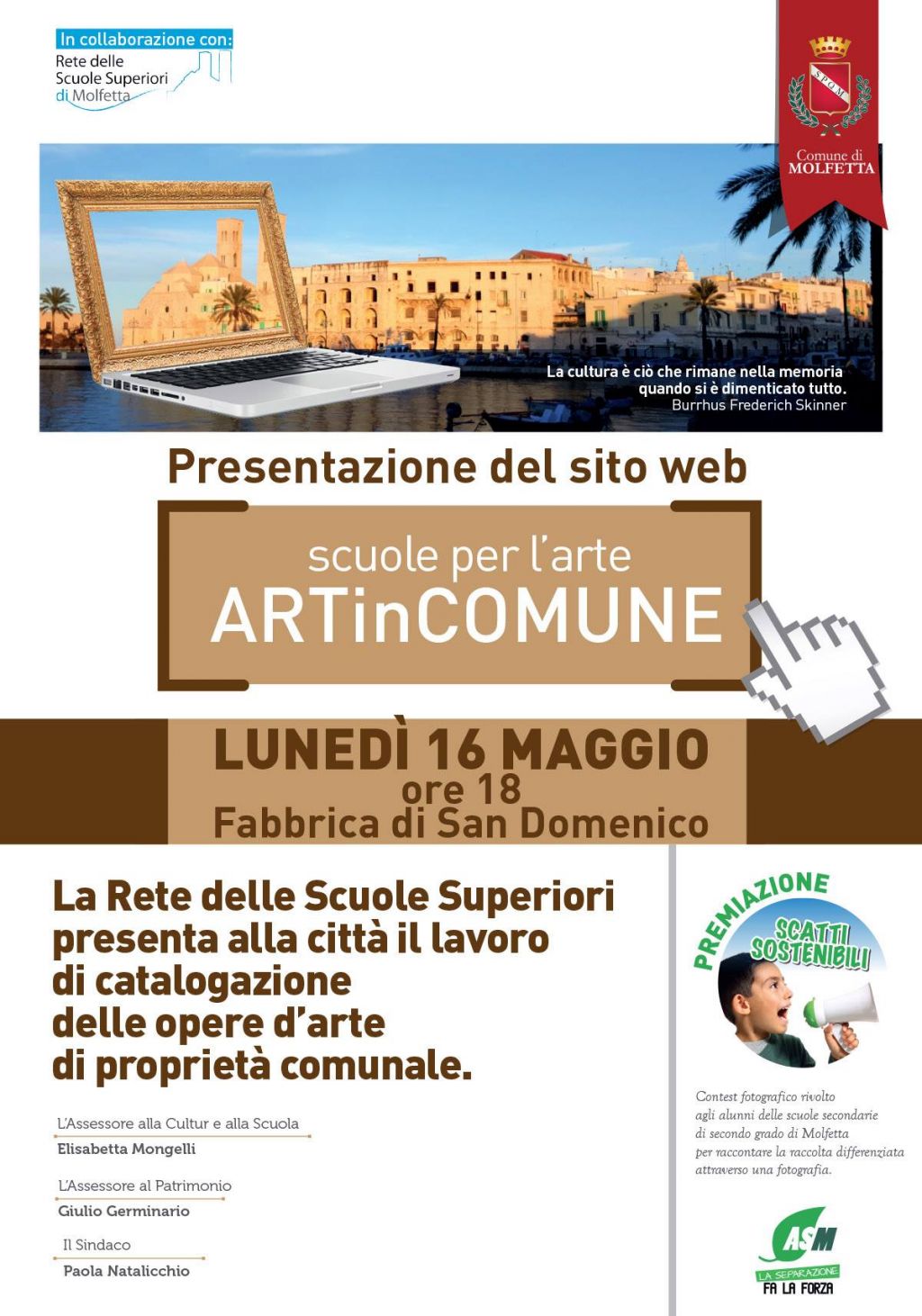 È così stato realizzato interamente dagli studenti il sito web: www.artincomune.com in cui sono stati catalogati e inventariati i beni culturali del Comune di Molfetta presenti nelle diverse sedi comunali. Il lavoro sarà presentato questa sera alle ore 18 alla Fabbrica di San Domenico con i Dirigenti scolastici, i docenti e gli studenti che hanno risposto con entusiasmo, cogliendo subito la valenza didattica del progetto e mettendo in campo le specifiche competenze e l'assessore alla cultura Betta Mongelli e al patrimonio Giulio Germinario.