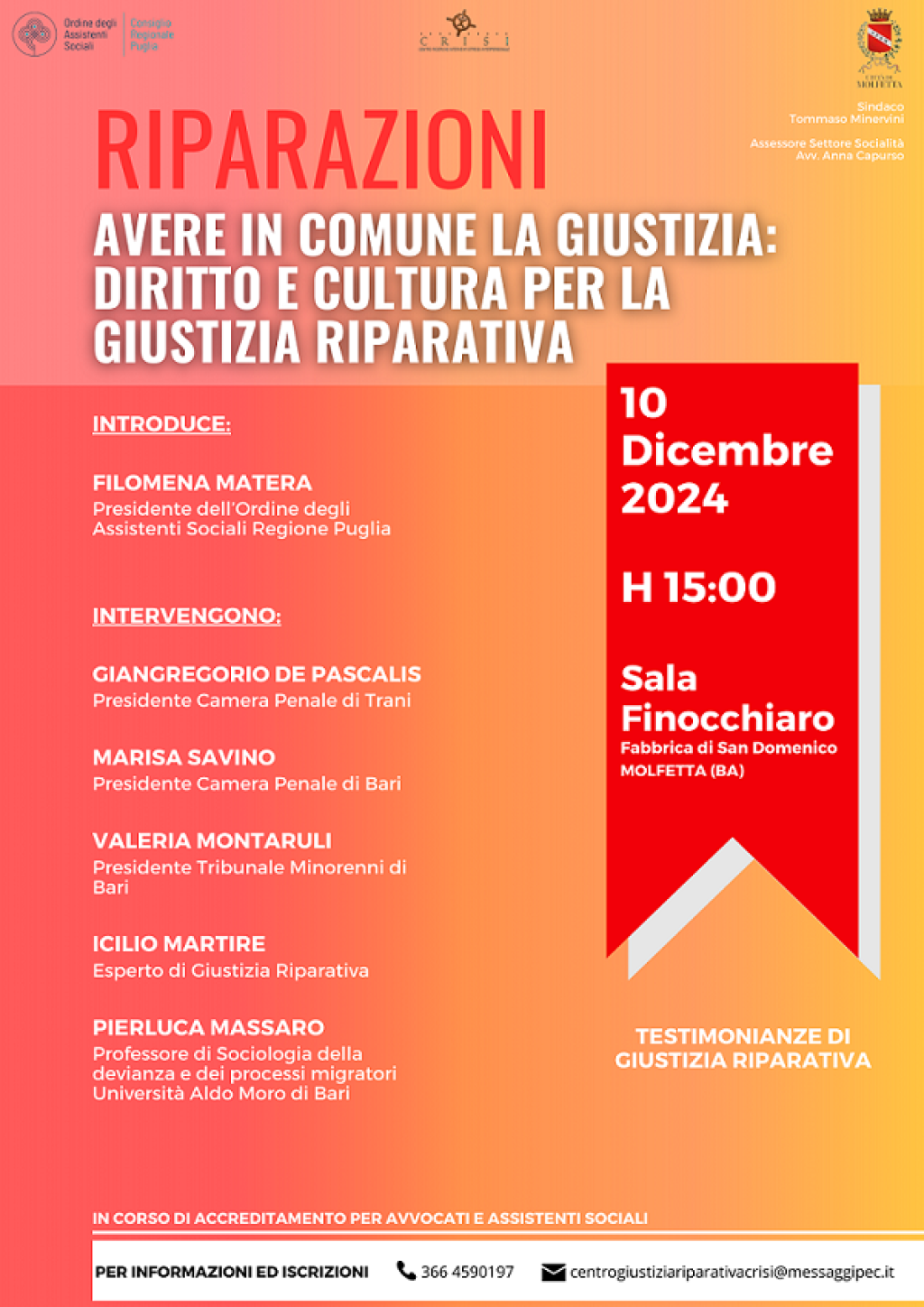 Per informazioni ed iscrizioni Telefono 366 4590197 – centrogiustiziariparativacrisi@messaggiopec.it