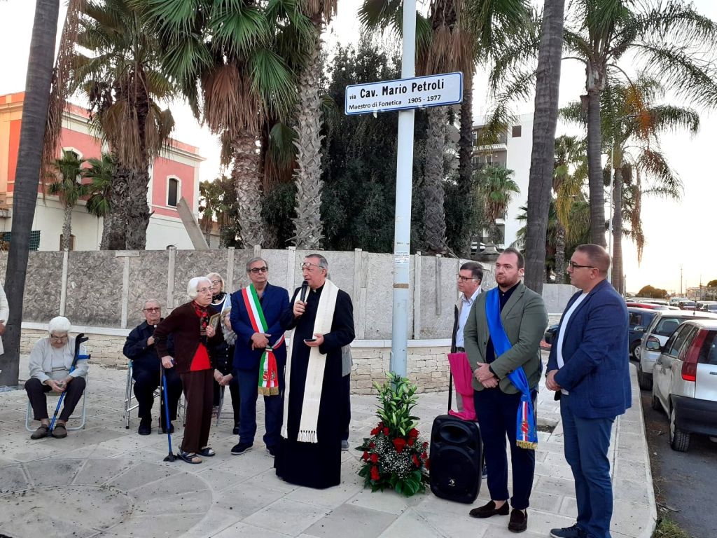 Alla cerimonia per lo scoprimento della targa, oltre ai familiari del cavalier Petroli, i figli Tanella, sacrista del Duomo, Lorenzo, Nella e Vincenza, i nipoti e conoscenti, hanno preso parte il Sindaco, Tommaso Minervini, il Presidente del Consiglio comunale, Robert Amato, l’assessore all’urbanistica Sergio de Candia, don Beppe de Ruvo, monsignor Giuseppe de Candia e il dottor Salvatore Gadaleta, che insieme hanno ricordato la figura di Mario Petroli.
