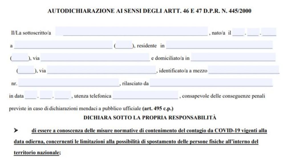 A partire da domani, 15 marzo, torna l’autocertificazione. Uscire di casa sarà consentito solo per comprovate esigenze lavorative, motivi di salute, motivi di urgenza (tra cui rientra la necessità di far la spesa). È inoltre vietato uscire dal Comune di residenza e quindi ogni spostamento in tal senso va motivato.