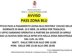 A partire da giovedì 24 aprile 2025 l'Ufficio per il rilascio dei pass (zona blu) si traferisce nella sede della Mtm, in Via de Funai, zona industriale, nei pressi della Multiservizi.