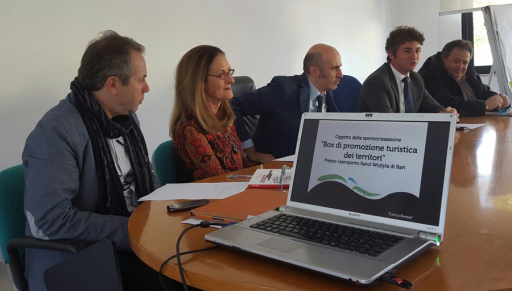 L'aeroporto Karol Wojtyla di Bari ha negli ultimi anni fatto registrare oltre 3,5 milioni di passeggeri e sarà la porta di accesso di Matera Capitale Europea della Cultura. Allora come è avvenuto con Expo, Molfetta all'interno di una rete virtuosa di Comuni, si attiva per intercettare i turisti e promuovere il territorio nel primo approdo in Puglia, lo scalo aeroportuale, vero fiore all'occhiello del sistema dei trasporti pugliese.Il Consorzio per lo Sviluppo dell'Area Conca Barese, costituito dai Comuni di Bitonto, Molfetta, Ruvo, Palo del Colle, Terlizzi e Giovinazzo, ha infatti opzionato un box di 100 mq nell'area arrivi dell'aeroporto in cui sarà possibile non solo divulgare informazioni sul patrimonio storico artistico e sugli itinerari turistici ma anche vendere i migliori prodotti realizzati sul territorio. Di qui l'avviso pubblico per la ricerca di sponsorizzazioni a sostegno del progetto presentato questa mattina in conferenza stampa da Betta Mongelli assessore alla cultura e al turismo del Comune di Molfetta, da Michele Abbaticchio sindaco di Bitonto, Domenico Conte sindaco di Palo del Colle, Tommaso de Palma sindaco di Giovinazzo, Michele Scardigno, assessore alle attività produttive Ruvo di Puglia.