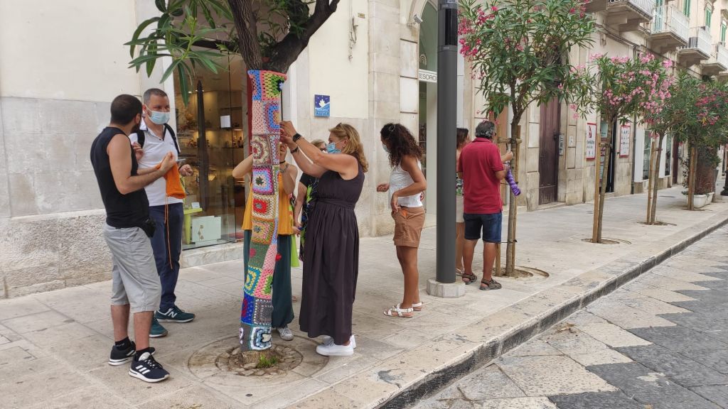 Alcuni alberi del Corso Umberto I sono stati bombardati di filato con una esplosione di colori, simbolo dell’incontro tra la comunità e la persona sordocieca, alla presenza del sindaco Tommaso Minervini e dell’assessore all’Ambiente Maridda Poli. Hanno contribuito all’iniziativa anche i bambini della seconda A e B della scuola elementare Rosaria Scardigno, realizzando pompon di lana colorati.