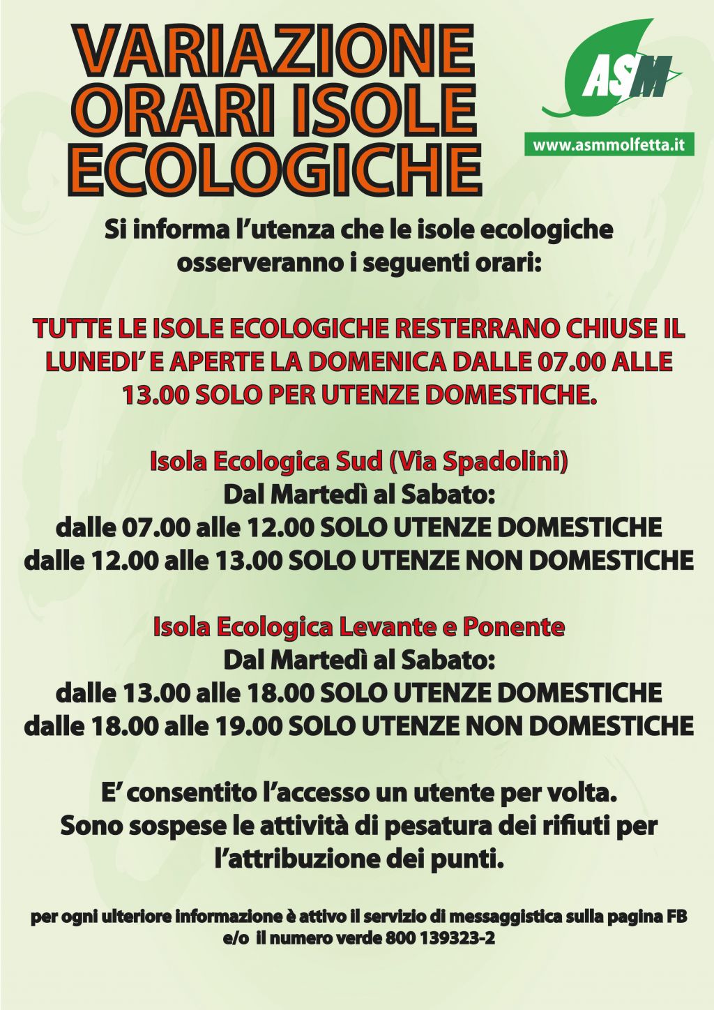 L’isola ecologica sud (Via Spadolini) sarà aperta dal martedì al sabato dalle 7 alle 12 solo per le utenze domestiche; dalle 12 alle 13 solo per le utenze non domestiche.