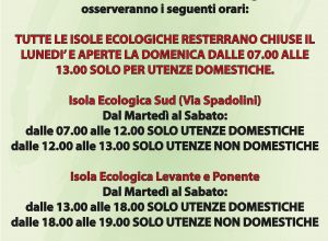 Le isole ecologiche di levante e di ponente saranno aperte dal martedì al sabato dalle 13 alle 18 solo per le utenze domestiche, dalle 18 alle 19 solo per quelle non domestiche.