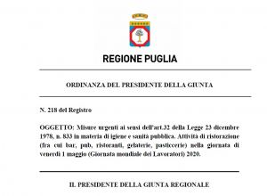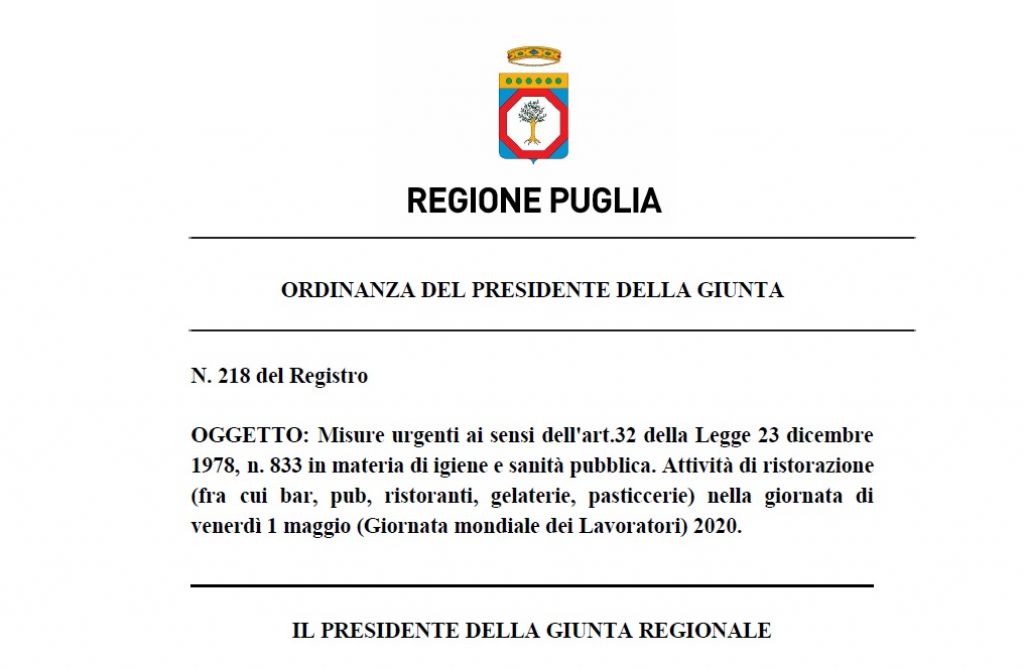 Lo ha disposto il Governatore Emiliano con l'ordinanza n.218 del 30 aprile: Misure urgenti ai sensi dell'art.32 della Legge 23 dicembre 1978, n. 833 in materia di igiene e sanità pubblica. Attività di ristorazione (fra cui bar, pub, ristoranti, gelaterie, pasticcerie) nella giornata di venerdì 1 maggio (Giornata mondiale dei Lavoratori) 2020.