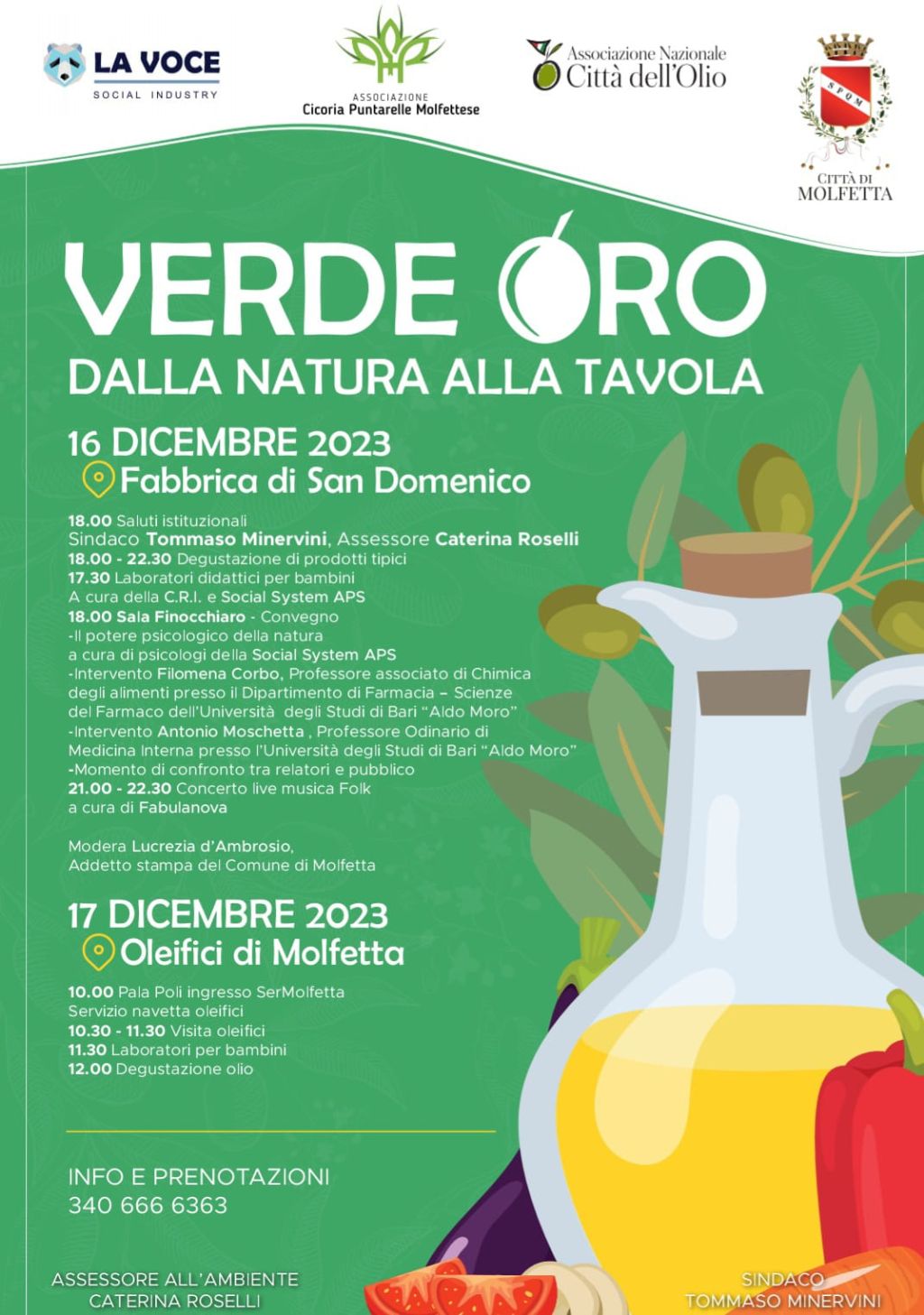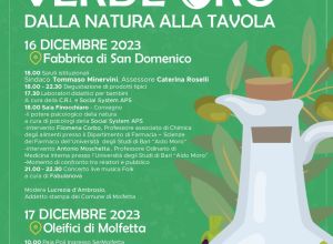 Il convegno, le degustazioni, i laboratori, le visite guidate, il concerto di musica folk. Tutto è pronto per “Verde Oro. Dalla natura alla tavola”, la manifestazione, voluta dall’assessorato all’ambiente del Comune di Molfetta, per promuovere l’utilizzo dell’olio extravergine d’oliva e le sue innumerevoli proprietà.