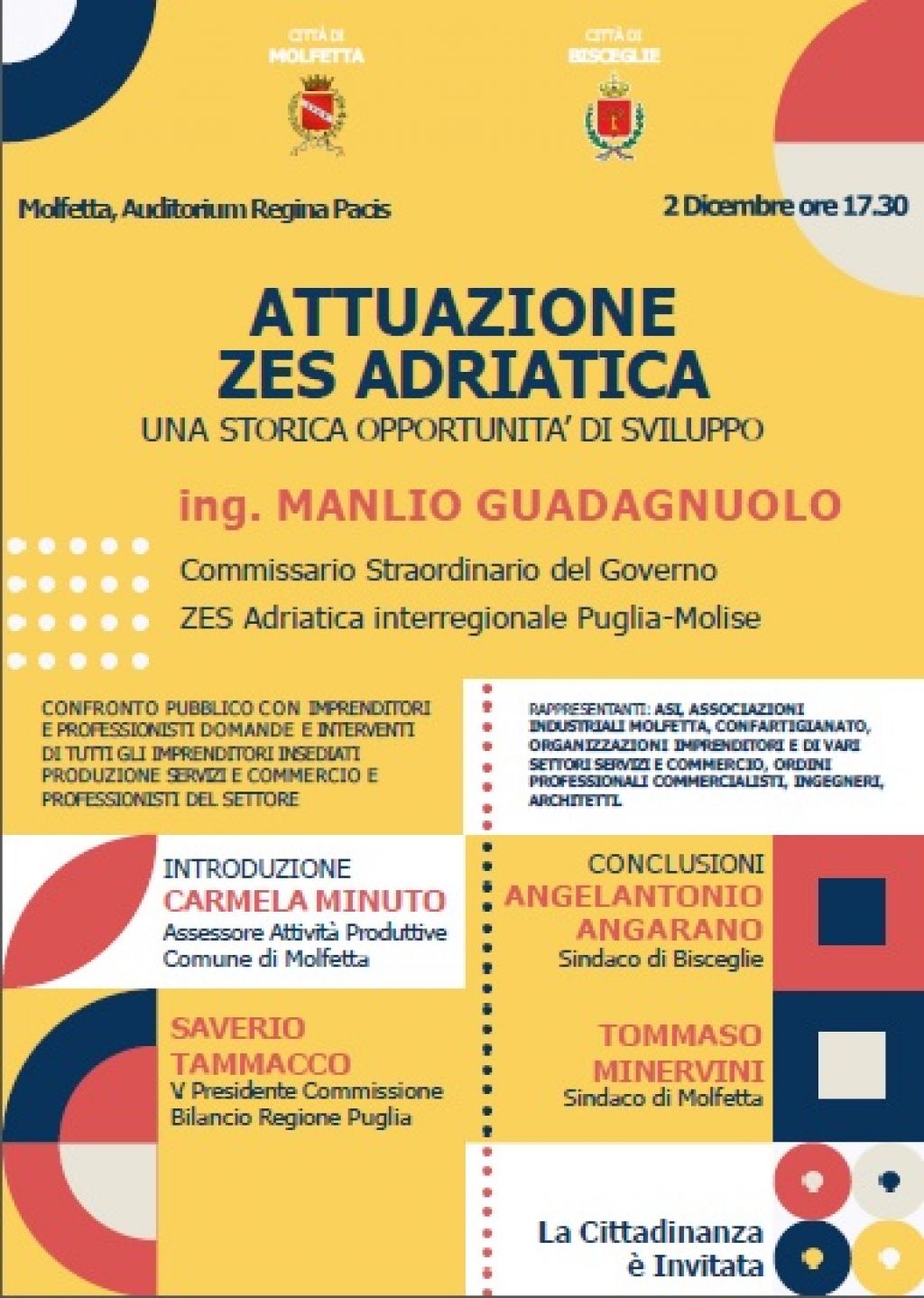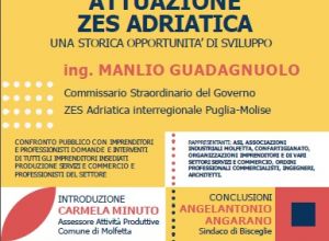 Le relazioni di Manlio Guadagnuolo, Commissario straordinario del Governo, e Saverio Tammacco, Vice presidente della Commissione Bilancio della Regione Puglia, renderanno il quadro operativo della Zes. Introdurrà l’assessore alle attività produttive del Comune di Molfetta, Carmela Minuto.