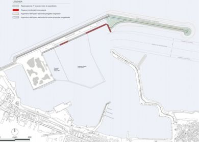 Riempimento del rilevato retrostante i cassoni con idoneo materiale di cava e formazione della scogliera di protezione del terrapieno sul lato terra; realizzazione di sottofondazioni, fondazioni e muretto di contenimento in c.a. in corrispondenza della scogliera di protezione del terrapieno sul lato terra; realizzazione di una scogliera di “chiusura” tra i cassoni del Martello e la diga Salvucci esistente.