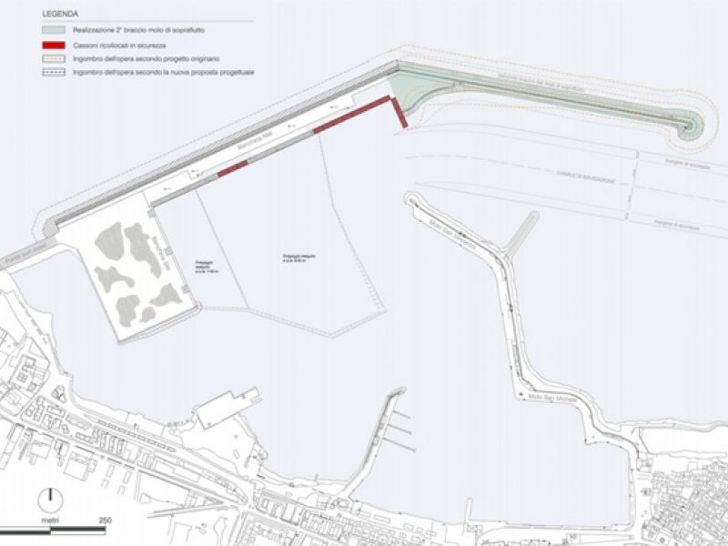 Messa in opera in corrispondenza della banchina Martello e nella posizione di progetto di n° 3 cassoni tipo E, privi di celle anti-risacca, già prefabbricati ed attualmente collocati nello specchio acqueo antistante la banchina di Nord Ovest. L’attività comprende la regolarizzazione e spianamento subacqueo; la realizzazione dello scanno di imbasamento; il salpamento dei cassoni dalla posizione attuale, il trasporto, l’affondamento in opera nella posizione di progetto ed il loro zavorramento con materiale idoneo; il ripristino del calcestruzzo e delle armature ammalorate; la formazione del giunto tra i cassoni; la “chiusura” dei cassoni con lastre prefabbricate in c.a.; il getto in opera della trave di coronamento in calcestruzzo debolmente armato prevista per la banchina Martello e la messa in opera dei relativi arredi portuali. È prevista l’installazione in testata del segnalamento marittimo a luce verde.